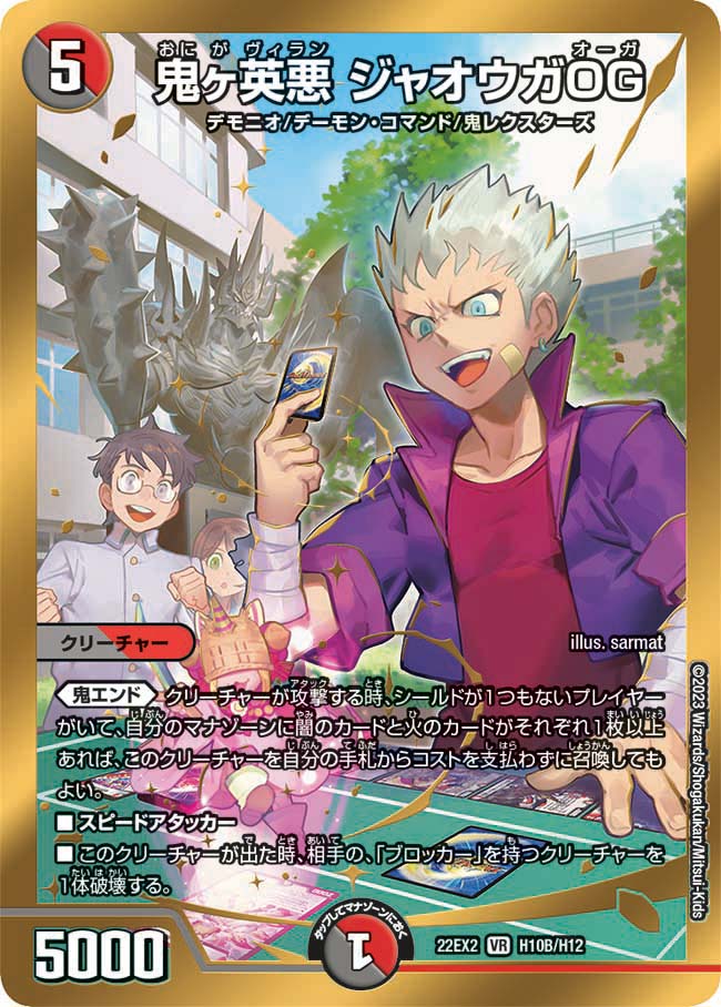 鬼エンド:クリーチャーが攻撃する時、シールドが1つもないプレイヤーがいて、自分のマナゾーンに闇文明と火文明があれば、このクリーチャーを自分の手札からコストを支払わずに召喚してもよい。<br>スピードアタッカー<br>このクリーチャーが出た時、相手の「ブロッカー」を持つクリーチャーを1体選び、破壊する。