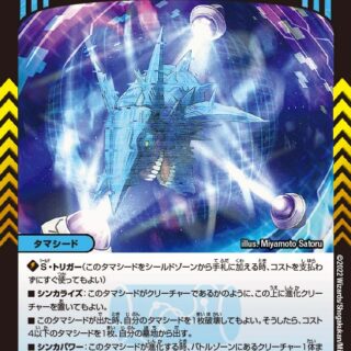 進化―自分の水のクリーチャー1体の上に置く。侵略―水のコスト3以上のクリーチャー(自分の水のコスト3以上のクリーチャーが攻撃する時、自分の手札にあるこのクリーチャーをその上に重ねてもよい)W・ブレイカー(このクリーチャーはシールドを2つブレイクする)このクリーチャーがバトルゾーンに出た時、自分の手札からクリーチャーを1体、このクリーチャーの下に重ねてもよい。そうしたら、カードを2枚引く。