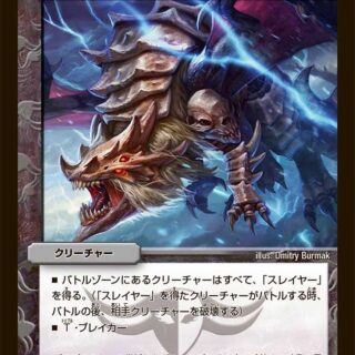 EXライフ(このクリーチャーを出す時、自分の山札の上から1枚目をシールド化する。このクリーチャーが離れる時、かわりにそのシールドを墓地に置く)W・ブレイカー自分のクリーチャーすべてに「スピードアタッカー」と「スレイヤー」を与える。このクリーチャーが攻撃する時、このクリーチャーの「EXライフ」シールドを墓地に置いてもよい。そうしたら、次の自分のターンのはじめまで、相手は呪文を唱えられない。