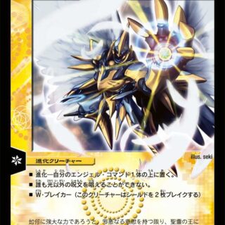 DMC58 7/16 カードの種類:クリーチャー 文明:闇 レアリティ:SR パワー:8000 コスト:7 マナ:1 種族:ダークロード/ドラゴン・ゾンビ/ナイト 特殊能力: このクリーチャーをバトルゾーンに出した時、自分の山札を見る。その中から闇のカードを1枚選び、自分の墓地に置いてもよい。その後、山札をシャッフルする。このクリーチャーが攻撃する時、自分の墓地にある闇のコストが6以下の呪文を1枚、コストを支払わずに唱えてもよい。その後、その呪文を自分の山札の一番下に置く。W・ブレイカー(このクリーチャーはシールドを2枚ブレイクする)