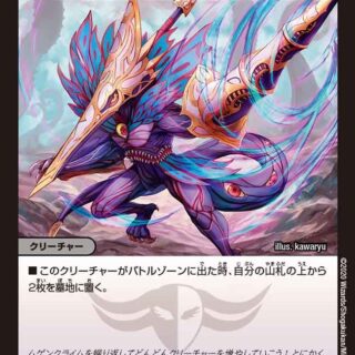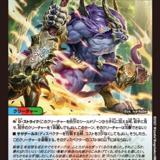 スピードアタッカーW・ブレイカー自分のターン中、バトルしているこのクリーチャーのパワーを∞にする。このクリーチャーはパワー6000以上のアンタップしているクリーチャーを攻撃できる。このクリーチャーがバトルに勝った時、カードを2枚引いてもよい。自分のターンのはじめに、このクリーチャーが自分の墓地にあり、バトルゾーンに自分の《熱血武闘 カツキング》がなければ、自分の手札を1枚捨て、自分のアウトレイジを1体破壊してもよい。そうしたら、このクリーチャーを出す。