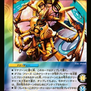 自分のクリーチャーが攻撃する時、自分の山札の上から1枚目を表向きにする。それが攻撃しているクリーチャーと同じコストの、クリーチャーまたはタマシードなら出す。そうでなければ、手札に加える。