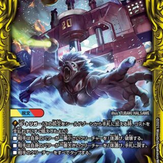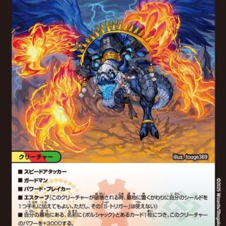 W・ブレイカー(このクリーチャーはシールドを2つブレイクする)このクリーチャーが出た時、自分のクリーチャーを2体破壊する。その後、相手は自身のクリーチャーを1体選んで破壊する。