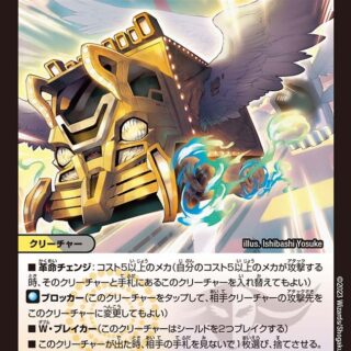 ブロッカー(このクリーチャーをタップして、相手クリーチャーの攻撃先をこのクリーチャーに変更してもよい)このクリーチャーは攻撃できない。このクリーチャーが出た時、自分の山札の上から2枚を墓地に置く。バトルゾーンと墓地にある自分のマフィ・ギャングはすべて、種族に魔導具を追加する。