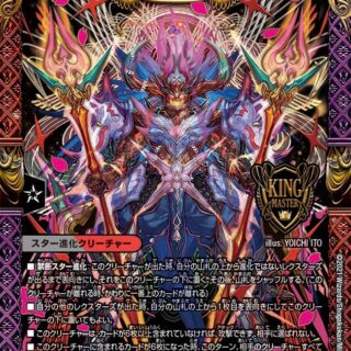 EXライフ(このクリーチャーを出す時、自分の山札の上から1枚目をシールド化する。このクリーチャーが離れる時、かわりにそのシールドを墓地に置く)T・ブレイカーこのクリーチャーが出た時、次の自分のターンのはじめまで、相手のクリーチャーの能力をすべて無視する。相手のターン中、相手がコスト9以下のクリーチャーを召喚した時またはコスト9以下の呪文を唱えた時、自分はカードを1枚引いてもよい。その後、コスト9以下の呪文を1枚、自分の手札からコストを支払わずに唱えてもよい。