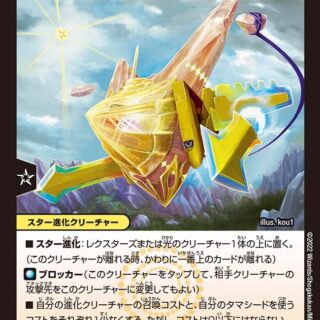 S・トリガー(このタマシードをシールドゾーンから手札に加える時、コストを支払わずにすぐ使ってもよい)シンカライズ:このタマシードがクリーチャーであるかのように、この上に進化クリーチャーを置いてもよい。シールド・セイバー(自分のシールドがブレイクされる時、かわりにこのタマシードを破壊してもよい)