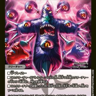 自分のクリーチャーすべてに「スピードアタッカー」を与える。相手のターン中に、相手のクリーチャーが召喚以外の方法で出る時、相手はかわりにそのクリーチャーを超次元ゾーンに置く。このクリーチャーが破壊された時、火のコスト6以下のウエポンを1枚、自分の超次元ゾーンから出してもよい。(自分のクリーチャー1体に装備して出す)