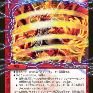 DMX09 19/56 カードの種類:クリーチャー 文明:火 レアリティ:R パワー:2000 コスト:7 マナ:1 種族:フレイム・モンスター/サムライ イラストレーター:Ishibashi Yosuke 特殊能力: S・トリガー(このクリーチャーをシールドゾーンから手札に加える時、コストを支払わずにすぐ召喚してもよい)このクリーチャーをバトルゾーンに出した時、相手のパワー2000以下のクリーチャーをすべて破壊する。 フレーバー: このタイミングでボンバー! —火焔タイガーグレンオー