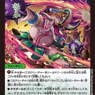 J・O・E 2 (このクリーチャーを、コストを2少なくして召喚してもよい。そうしたら、このターンの終わりに、これを自分の山札の一番下に置く。下に置いたら、カードを1枚引く)スピードアタッカーW・ブレイカースマッシュ・バースト(このクリーチャーが攻撃する時、このカードの呪文側を、バトルゾーンに置いたままコストを支払わずに唱えてもよい)