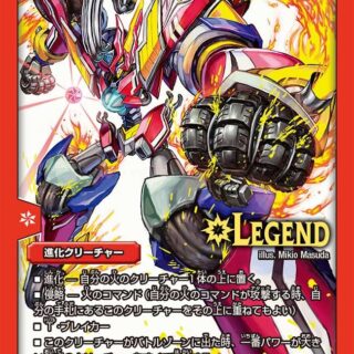 革命0トリガー:クリーチャーが自分を攻撃する時、自分のシールドが1枚もなければ、この呪文をコストを支払わずに唱えてもよい。自分の山札の上から4枚を見せ、その中から火のクリーチャーを1体選ぶ。そのクリーチャー以下のパワーを持つ相手のクリーチャーを1体破壊する。この呪文を唱えた後、墓地に置くかわりに自分の山札に加えてシャッフルする。