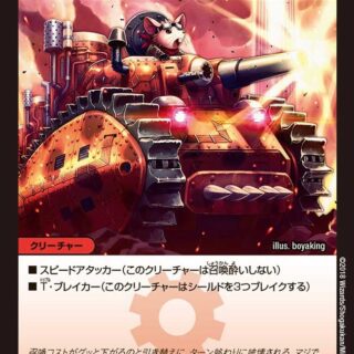 スター進化:レクスターズまたは火のクリーチャー1体の上に置く。(このクリーチャーが離れる時、かわりに一番上のカードが離れる)W・ブレイカーこのクリーチャーが攻撃する時、相手のパワー7000以下のクリーチャーを1体破壊する。相手のターン中にこのカードが離れた時、このターンの後に自分のターンを追加する。