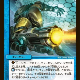 ブロッカー(このクリーチャーをタップして、相手クリーチャーの攻撃先をこのクリーチャーに変更してもよい)このクリーチャーは攻撃できない。このクリーチャーがバトルする時、バトルの後、破壊する。