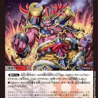 S・トリガー(この呪文をシールドゾーンから手札に加える時、コストを支払わずにすぐ唱えてもよい)GR召喚を2回する。このターン、そのクリーチャーに「スピードアタッカー」を与える。(GR召喚:自分の超GRの上から1枚目を、コストを支払ったものとして召喚する)(「スピードアタッカー」を持つクリーチャーは召喚酔いしない)