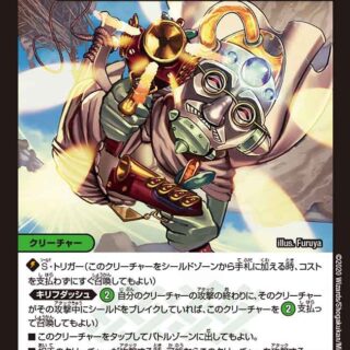 これを付けたクリーチャーに「パワード・ブレイカー」を与える。(「パワード・ブレイカー」を持つクリーチャーは、そのパワー6000ごとにシールドをさらに1つブレイクする)これをクリーチャーに付けた時、自分のクリーチャーを2体破壊する。その後、相手は自身のクリーチャーを1体選び、破壊する。