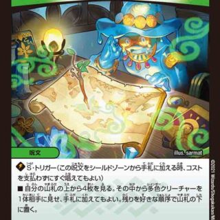 S・トリガー(この呪文をシールドゾーンから手札に加える時、コストを支払わずにすぐ唱えてもよい)自分の山札の上から3枚を見る。その中から呪文を1枚選び、相手に見せてから手札に加えてもよい。残りを好きな順序で山札の一番下に置く。