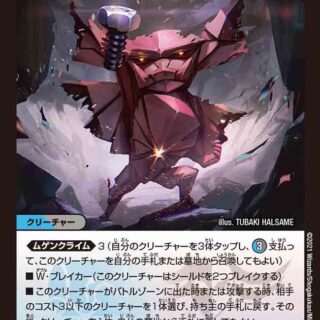W・ブレイカー(このクリーチャーはシールドを2つブレイクする)このクリーチャーがバトルゾーンに出た時、自分のシールドを1つ相手に選ばせ、手札に加える。(その「S・トリガー」を使ってもよい)