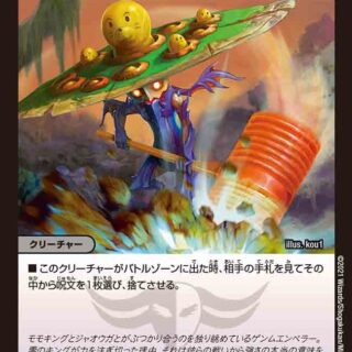 マナドライブ5(水):このクリーチャーがバトルゾーンに出た時、自分のマナゾーンのカードが5枚以上で水文明があれば、相手のクリーチャーを1体選び、持ち主の手札に戻す。(ゲーム開始時、GRクリーチャーは山札には含めず、自分の超GRに置き、バトルゾーン以外のゾーンに行った場合、超GRの一番下に戻す)