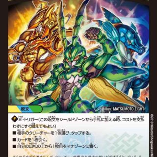 このクリーチャーが攻撃する時、GR召喚する。(GR召喚:自分の超GRの上から1枚目を、コストを支払ったものとして召喚する)自分の他のクリーチャーがバトルゾーンに出た時、それがこのターン中バトルゾーンに出た自分の2体目のクリーチャーなら、このクリーチャーをアンタップする。