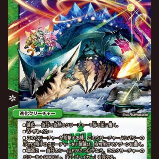 W・ブレイカーこのクリーチャーがバトルゾーンに出た時、自分の手札をすべて捨てる。G・G・G:自分の手札が1枚以下なら、自分の山札の上から1枚目を見てもよい。自分のターン中、攻撃する前ならいつでも、そのカードがクリーチャーなら召喚してもよい。それが呪文なら唱えてもよい。(コストは支払う)