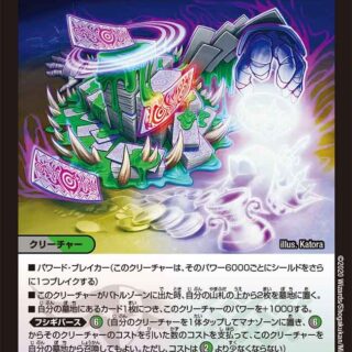 S・トリガー(このクリーチャーをシールドゾーンから手札に加える時、コストを支払わずにすぐ召喚してもよい)スマッシュ・バースト(このクリーチャーが攻撃する時、このカードの呪文側を、バトルゾーンに置いたままコストを支払わずに唱えてもよい)