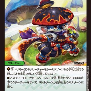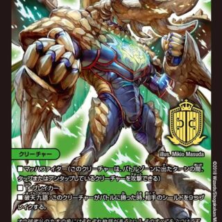マッハファイター(このクリーチャーは、バトルゾーンに出たターンの間、タップまたはアンタップしているクリーチャーを攻撃できる)T・ブレイカー(このクリーチャーはシールドを3つブレイクする)このクリーチャーがバトルに勝った時、自然のコスト6以下の、進化ではないクリーチャーを1体、自分のマナゾーンからバトルゾーンに置いてもよい。