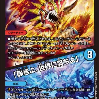 スーパー・S・トリガー(この呪文を自分のシールドゾーンから手札に加える時、コストを支払わずにすぐ唱えてもよい。その時自分のシールドが1つもなければ、この呪文にoB 能力を与える)相手のクリーチャーを1体選び、持ち主のマナゾーンに置く。oB 自然のパワー15000以下の進化ではないクリーチャーを1体、自分のマナゾーンからバトルゾーンに出してもよい。