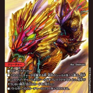 マナゾーンに置く時、このカードはタップして置く。ブロッカー(このクリーチャーをタップして、相手クリーチャーの攻撃先をこのクリーチャーに変更してもよい)W・ブレイカーこのクリーチャーが攻撃またはブロックする時、カードを1枚引く。その後、コスト7以下の呪文を1枚、コストを支払わずに自分の手札から唱えてもよい。
