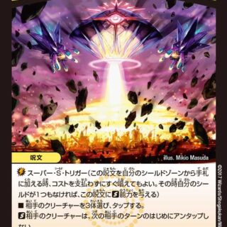 マナゾーンに置く時、このカードはタップして置く。革命チェンジ-光または自然のドラゴン(自分の光または自然のドラゴンが攻撃する時、そのクリーチャーと手札にあるこのクリーチャーを入れ替えてもよい)ブロッカーW・ブレイカーこのクリーチャーがバトルゾーンに出た時、自分の山札の上から1枚目をマナゾーンに置く。その後、多色カードを1枚、自分のマナゾーンから手札に戻してもよい。