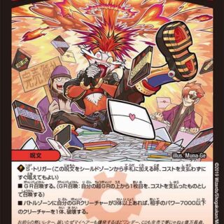 マナゾーンに置く時、このカードはタップして置く。自分の山札の上から2枚を見る。そのうちの1枚を自分の手札に加え、もう1枚を墓地に置く。チャージャー(この呪文を唱えた後、墓地に置くかわりに自分のマナゾーンに置く)