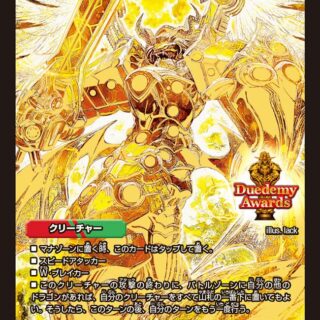 進化―自分の火のクリーチャー1体の上に置く。侵略―火のコスト5以上のクリーチャーW・ブレイカーこのクリーチャーがバトルゾーンに出た時、相手のパワー5000以下のクリーチャーを1体、破壊する。このクリーチャーの下にカードが3枚以上重ねてあれば、かわりに相手のクリーチャーをパワーの合計が8000以下になるよう好きな数選び、破壊する。
