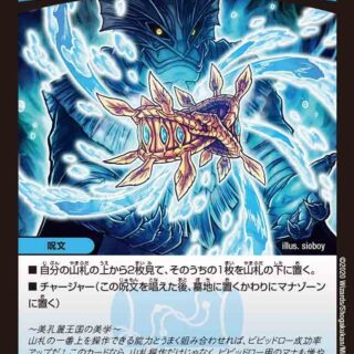 進化―自分の光のクリーチャー1体の上に置く。侵略―光のコスト3以上のクリーチャー(自分の光のコスト3以上のクリーチャーが攻撃する時、自分の手札にあるこのクリーチャーをその上に重ねてもよい)ブロッカーW・ブレイカー(このクリーチャーはシールドを2つブレイクする)自分のターンの終わりに、このクリーチャーをアンタップする。