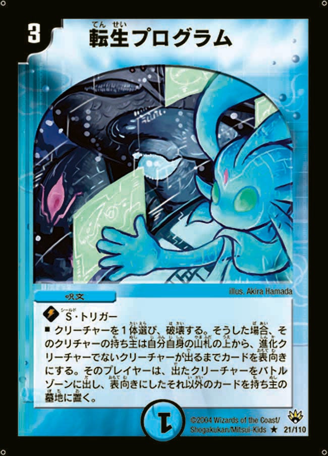 S・トリガークリーチャーを1体破壊する。そうした場合、そのクリーチャーの持ち主は、自分自身の山札の上から進化以外のクリーチャーが出るまでカードを表向きにする。そのプレイヤーは、出たクリーチャーをバトルゾーンに出し、表向きにしたそれ以外のカードを持ち主の墓地に置く。