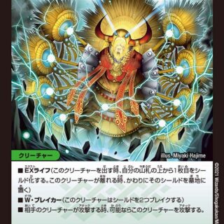 マナゾーンに置く時、このカードはタップして置く。ブロッカー(このクリーチャーをタップして、相手クリーチャーの攻撃先をこのクリーチャーに変更してもよい)スピードアタッカー(このクリーチャーは召喚酔いしない)自分のターンの終わりに、このクリーチャーをアンタップする。