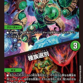 W・ブレイカーこのクリーチャーがバトルゾーンに出た時、他のアンタップされているクリーチャーをすべて破壊する。