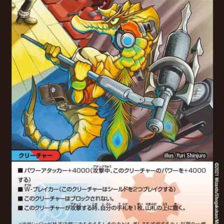W・ブレイカー(このクリーチャーはシールドを2つブレイクする)シールド・セイバー(自分のシールドがブレイクされる時、かわりにこのクリーチャーを破壊してもよい)このクリーチャーがバトルゾーンに出た時、自分のシールドをひとつ墓地に置く。