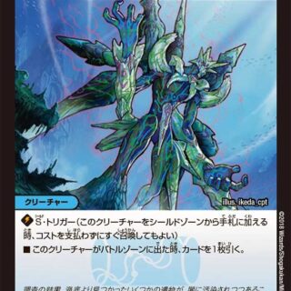 S・トリガー(この呪文をシールドゾーンから手札に加える時、コストを支払わずにすぐ唱えてもよい)相手のアンタップしているクリーチャーを1体選び、持ち主のマナゾーンに置く。