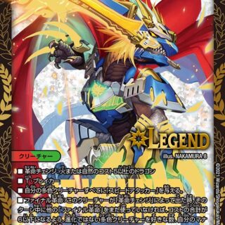 進化-自分の光のコスト9のクリーチャー1体の上に置く。侵略―光のコスト9の進化クリーチャーT・ブレイカーこのクリーチャーがバトルゾーンに出た時、光のコスト9のクリーチャーを9体まで、自分の手札またはマナゾーンからバトルゾーンに出してもよい。