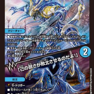 G・ゼロ – バトルゾーンに自分の火のドラグナーがあれば、この呪文をコストを支払わずに唱えてもよい。バトルゾーンにあるクリーチャーを1体選ぶ。このターン、そのクリーチャーは「スピードアタッカー」を得、種族にガイアール・コマンド・ドラゴンを追加する。(スピードアタッカーを得たクリーチャーは召喚酔いしない)