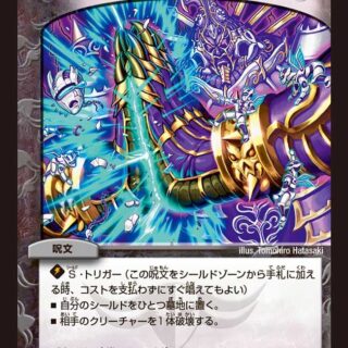 S・トリガー(この呪文をシールドゾーンから手札に加える時、コストを支払わずにすぐ唱えてもよい)バトルゾーンにある相手のタップされていないクリーチャーを1体選び、持ち主の手札に戻す。マナ武装 5:自分のマナゾーンに水のカードが5枚以上あれば、バトルゾーンにあるクリーチャーを1体選び、持ち主の手札に戻してもよい。