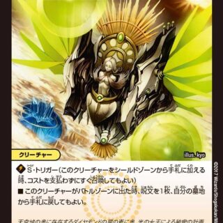 {SG}シールド・ゴー(このクリーチャーが破壊された時、新しいシールドとして自分のシールドゾーンに表向きのまま加える。このクリーチャーが表向きで、シールドゾーンを離れる時、かわりに自分の墓地に置く)このクリーチャーを表向きにして自分のシールドゾーンに加えた時、相手のパワー2000以下のクリーチャーを1体破壊する。