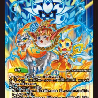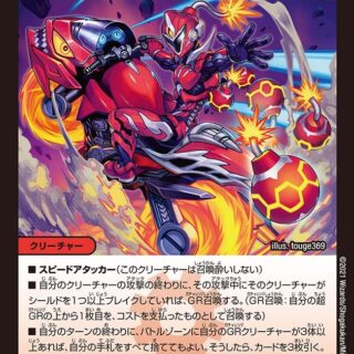 マナゾーンに置く時、このカードはタップして置く。スピードアタッカー(このクリーチャーは召喚酔いしない)スリリング・スリー:アウトレイジ(このクリーチャーをバトルゾーンに出した時、自分の山札の上から3枚をすべてのプレイヤーに見せる。表向きにしたアウトレイジ1体につき、次の h 能力を1回行ってもよい。その後、表向きにしたカードをすべて、好きな順序で山札の一番下に戻す) h このターン、このクリーチャーはシールドをさらに1枚ブレイクする。