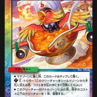 ガードマン(自分の他のクリーチャーが攻撃される時、このクリーチャーをタップしてもよい。そうした場合、攻撃クリーチャーはかわりにこのクリーチャーを攻撃する)このクリーチャーを召喚する時、自分の手札からコスト7以上のカードを1枚、相手に見せてもよい。そうした場合、このクリーチャーの召喚コストは最大2少なくなる。ただし、コストは1より少なくならない。W・ブレイカー(このクリーチャーはシールドを2枚ブレイクする)