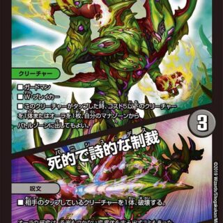 進化V-自分の火のクリーチャー2体を重ねた上に置く。バトルゾーンにある自分のドラゴンとフェニックスは、タップされていないクリーチャーを攻撃できる。このクリーチャーがバトルゾーンを離れる時、このクリーチャーを墓地に置くかわりに自分の墓地またはマナゾーンから火のクリーチャーを好きな数、手札に戻してもよい。その後、このクリーチャーを山札に戻し、シャッフルする。T・ブレイカー