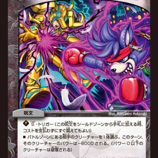 マナゾーンに置く時、このカードはタップして置く。S・トリガー自分のパワー5000以下のクリーチャーを1体破壊する。そうした場合、相手のパワー5000以下のクリーチャーを1体破壊する。