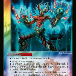 このクリーチャーと同じ種族を持つ自分のクリーチャーは「スレイヤー」を得る。G・リンク《闘神タウロス》の左横(バトルゾーンに自分の指定ゴッドがあれば、このカードをリンクしてもよい。リンクしたゴッドは、各ゴッドの特性〔パワーや能力〕を持つ1体のクリーチャーとなる。バトルゾーンを離れる時は、どちらか1枚を選ぶ)このクリーチャーは、リンクしている時「W・ブレイカー」を得る。