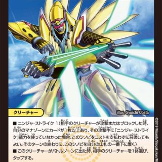 このクリーチャーが攻撃する時、自分のマナゾーンにある光のカードを2枚タップしてもよい。そうした場合、そのターンの終わりに、このクリーチャーをアンタップする。