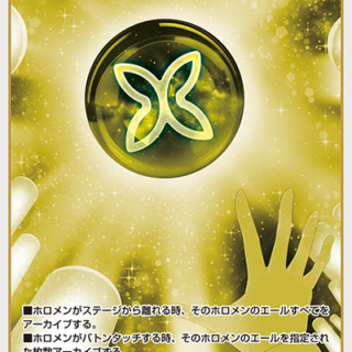 カードタイプ:エール レアリティ:P 収録商品:PRカード 能力テキスト:■ホロメンがステージから離れる時、そのホロメンのエールすべてをアーカイブする。■ホロメンがバトンタッチする時、そのホロメンのエールを指定された枚数アーカイブする。