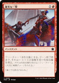 確実な一撃/Sure Strike (かくじつないちげき) (1)(赤)インスタント FDN, コモンクリーチャー1体を対象とする。ターン終了時まで、それは+3/+0の修整を受け、先制攻撃を得る。(それは先制攻撃を持たないクリーチャーよりも先に戦闘ダメージを与える。)Illus.Izzy (209/0)