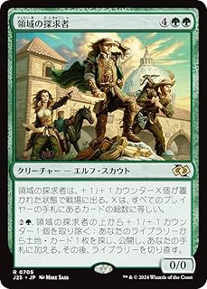領域の探求者/Realm Seekers (りょういきのたんきゅうしゃ) (4)(緑)(緑)クリーチャー ― エルフ(Elf)・スカウト(Scout) CNS, レア領域の探求者は、+1/+1カウンターがX個置かれた状態で戦場に出る。Xはすべてのプレイヤーの手札にあるカードの総数である。(2)(緑),領域の探求者の上から+1/+1カウンターを1個取り除く:あなたのライブラリーから土地カードを1枚探し、それを公開してあなたの手札に加え、その後ライブラリーを切り直す。0/0Illus.Mike Sass (38/210)