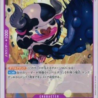 テキスト:【ブロッカー】(相手のアタックの後、このカードをレストにし、アタックの対象をこのカードにできる)【登場時】自分の場のドン!!が8枚以上ある場合、カード1枚を引き、自分の手札1枚を捨てる。